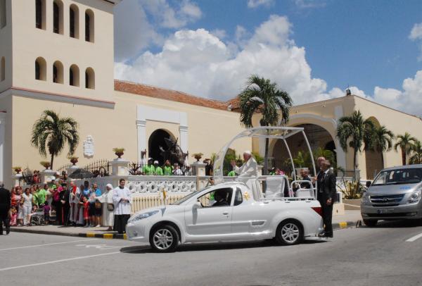 Llegó a la Catedral bajo una fina llovizna que terminó con fuertes goterones al final de la tarde, frente al antiguo Seminario de San Carlos y San Ambrosio -ahora Centro Cultural “Félix Varela”-, donde se reunió con miles de jóvenes que corearon su nombre y lo mimaron con fuertes ovaciones. Francisco se dejó querer e improvisó sus palabras, tanto en las Vísperas -que dirigió dentro del templo el Cardenal Jaime Ortega, Arzobispo de La Habana-, como en el exterior del viejo edificio conciliar. Luego salió en el papamóvil criollo a cielo descubierto y mojado por la lluvia. Lo vimos tomar la Avenida del Puerto con el mar como telón de fondo y repartiendo saludos y sonrisas a cuanta gente se topaba, la mayoría debajo de sus sombrillas.
