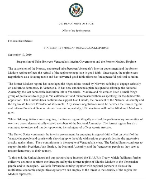 The former Maduro regime’s usual practices of harassment, violence & lies are to blame for the failure of the Norway talks to produce a peaceful resolution to the #Venezuela crisis. We salute #Norway and @Jguaido’s Interim government good faith efforts.