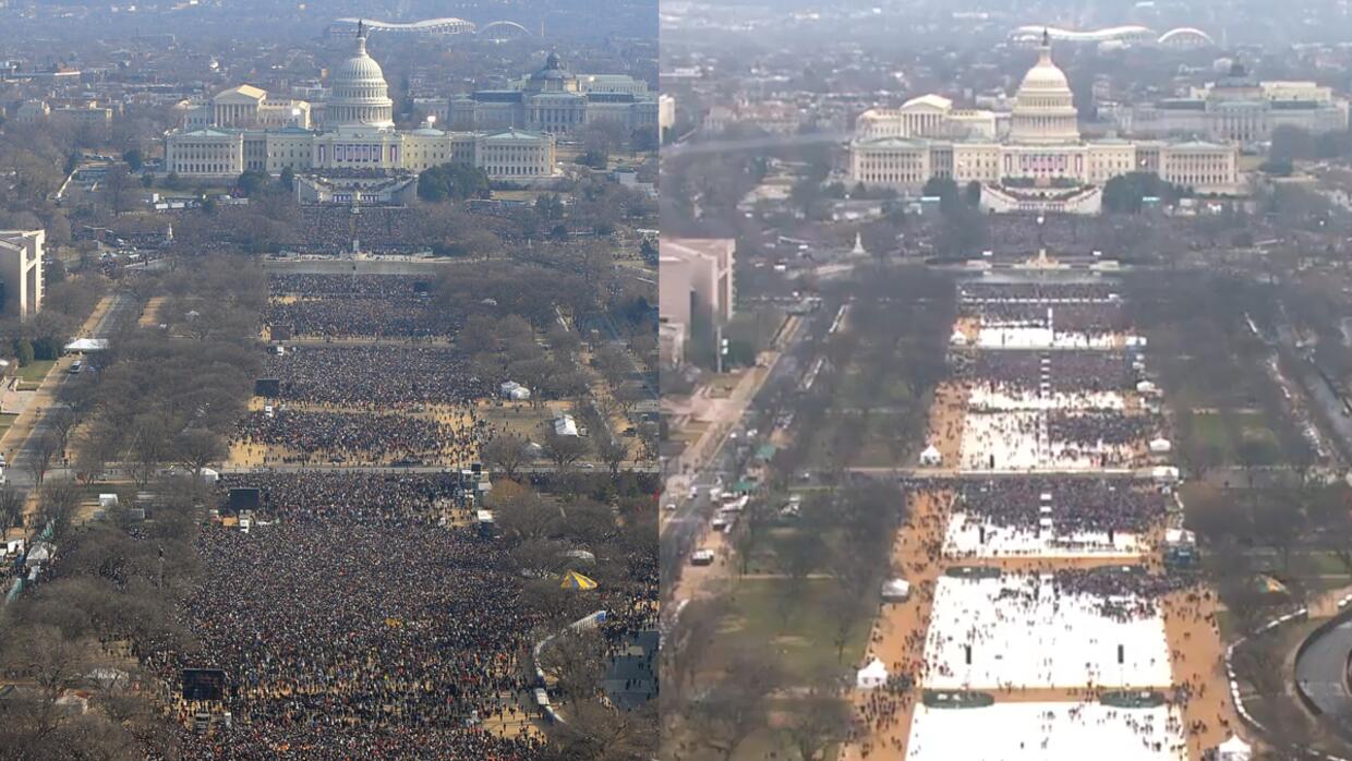 Las comparaciones entre ambos días comenzaron ya ayer por la noche, cuando varios usuarios de Twitter llamaron la atención sobre unas imágenes aereas del tradicional concierto inaugural que se celebra en la víspera de la toma de posesión del presidente de Estados Unidos. Las fotografías, que mostraban una menor asistencia al evento de Trump, se viralizaron rápidamente.